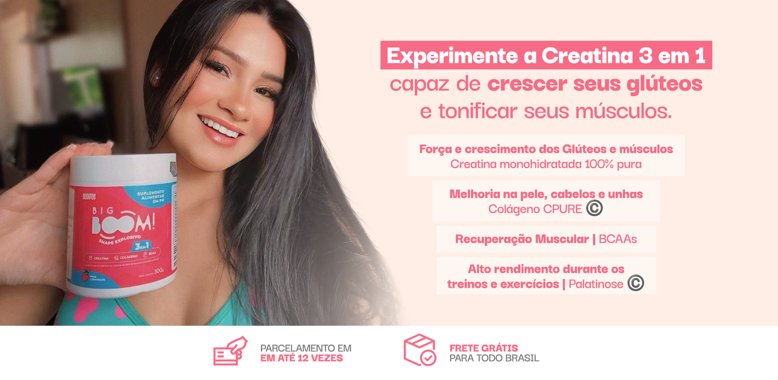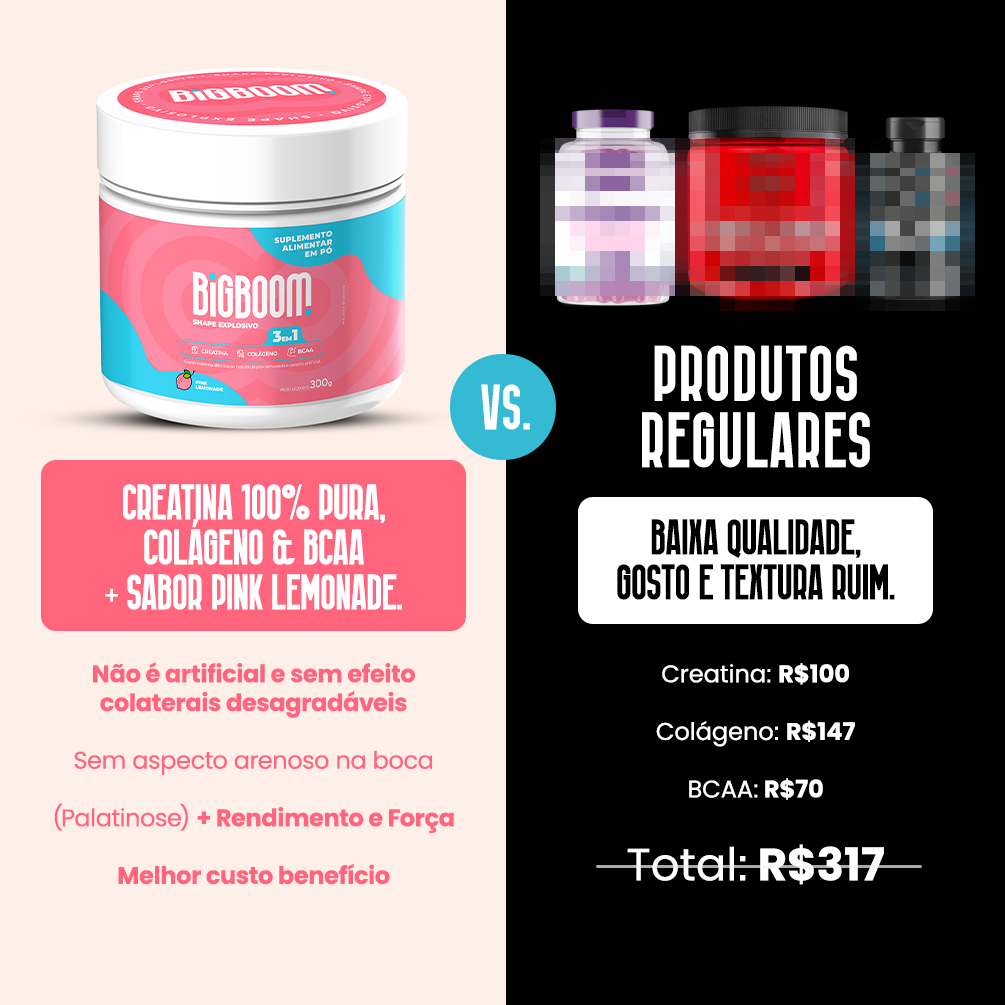 BigBoom não é apenas mais uma creatina comum. É a primeira 3 em 1, com colágeno e BCAA do Brasil, além do sabor incrível de Pink lemonade. Reunimos tudo que uma mulher precisa para ter um shape incrível, alinhando sua dieta e treinos com nossa creatina.